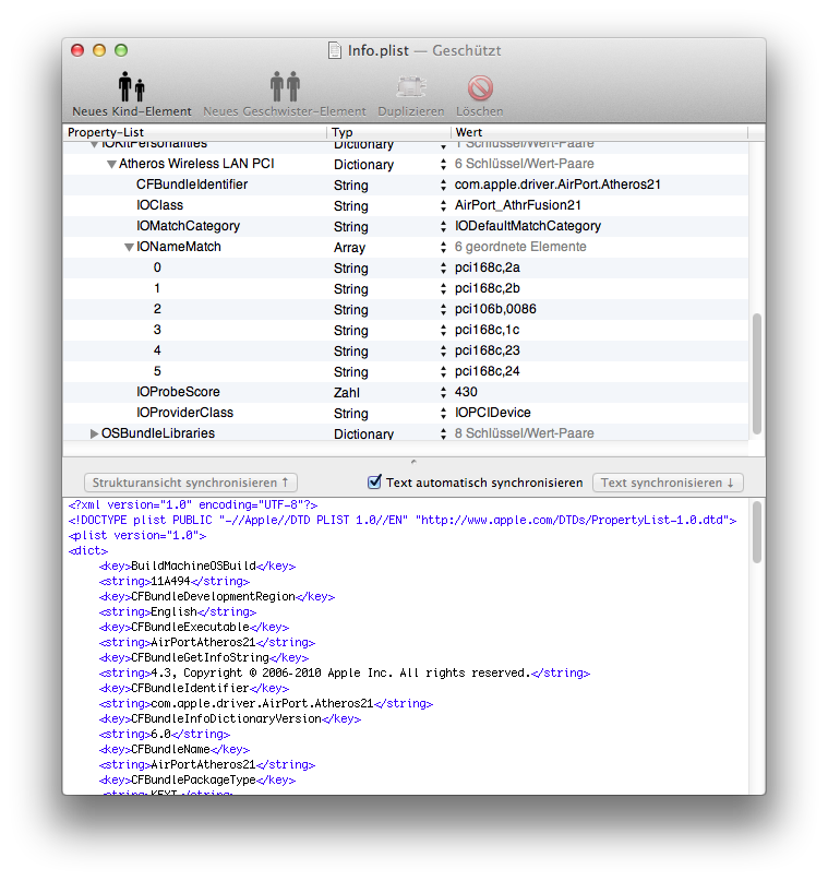 Wenn ich über den kext wizard die kext Datei manuell laden möchte kommt folgende Fehlermeldung "/System/Library/Extensions/AirportAtheros21.kext failed to load - (libkern/kext) dependency load failed; Check the system/Kernel Logs for errors or Rey kextutil(8)."