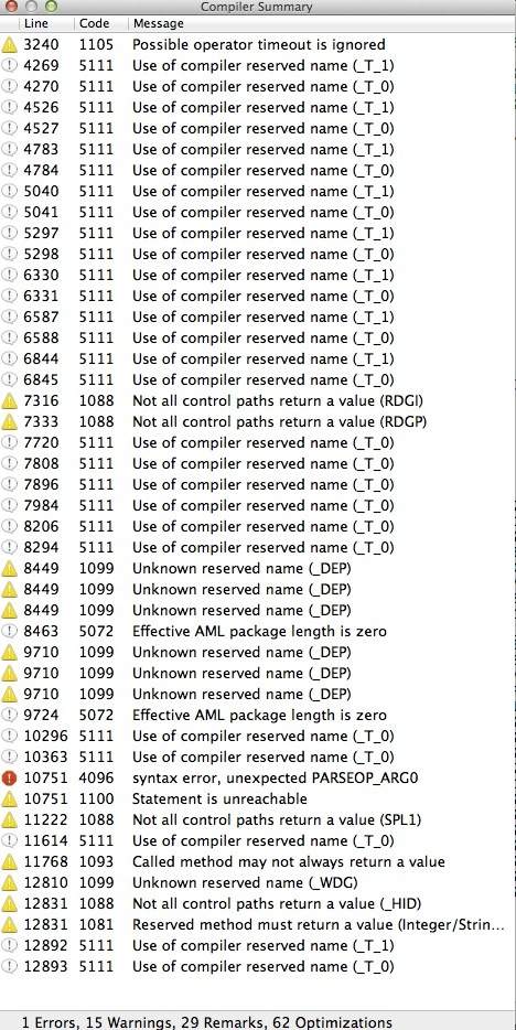 So lässt sie sich auf Grund des Fehlers nicht Compilieren also allgemeine Behebung des Fehlers und den Rest merzt man gleich mit aus, Warnings und Remarks kann man zwar so lassen, aber wenn man schon dabei ist ;) Anschliessend noch ein paar allgemeine Patches die Hauptsächlich dazu dienen die DSDT Apple freundlicher zu machen, aber unter den Restlichen BS dieser Welt nicht stören.