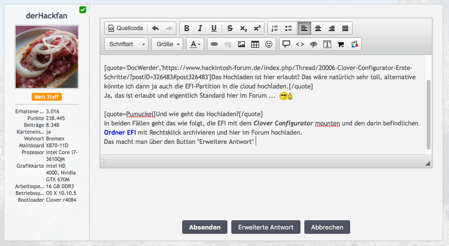 Schlag mich nicht: Das Hochladen ist hier erlaubt? Das wäre natürlich sehr toll, alternative könnte ich dann ja auch die EFI-Partition in die cloud hochladen. Gibt's eine Anleitung hier im Forum, wie ich das auf den USB_Stick bekomme, oder reicht es einfach im Explorer (bei Windows) in der EFI-Partition die config.plist auszutauschen??