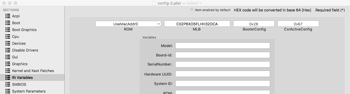 • Ich hab aus Deiner Serien-Nummer eine 17-Stellige MLB gemacht, das und der Eintrag "UseMacAddr0" sind Vorraussetzungen für den Gebrauch der Apple-Dienste iMessage & Co., aber für den ersten Start nicht unbedingt notwendig. Die 0x67 bei der CrsActiveConfig sorgt allerdings erst dafür, dass Dein System Änderungen überhaupt an nimmt, ist also am Anfang dringend notwendig.