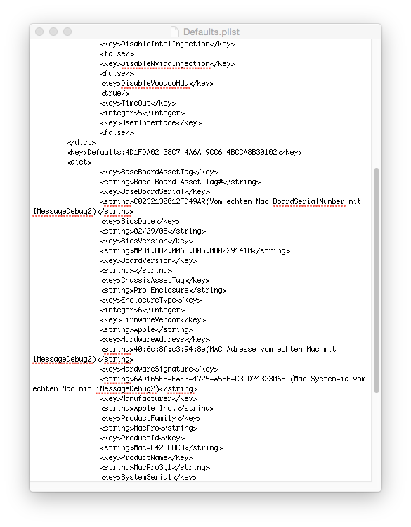 I have data from an original iMac (friend one) and I got now "Not delivered"Ich weiß nicht, wie genau geben Sie System-ID / HardwareUUID Formeln in defaults.plist.