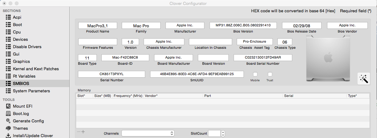Der Eintrag SmUUID aus dem Bereich SMBIOS des CloverConfigurator (welcher die Hardware UUID darstellt) muss NICHT gefüllt werden.
