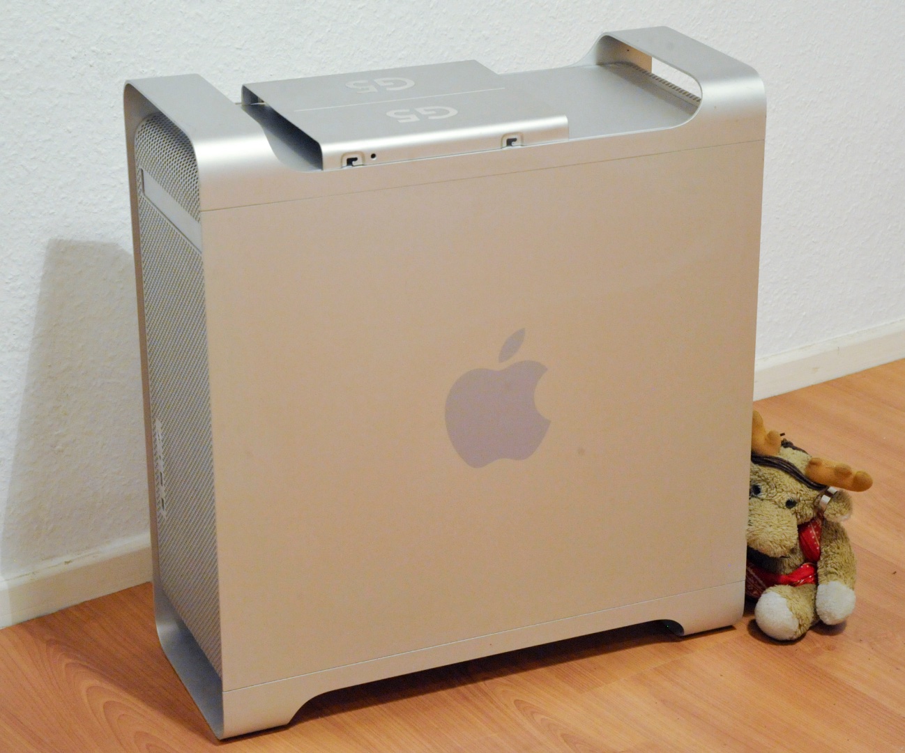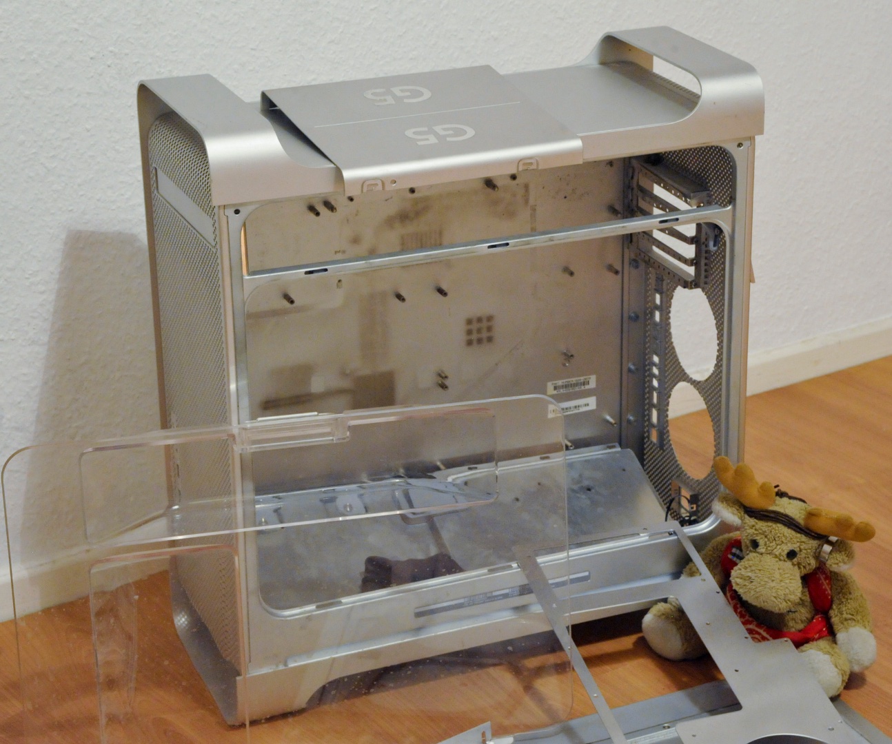 Der G5 ist ein alter Bekannter, da tut so ein Umbau immer erstmal weh: der stand ein paar Jahre als Backup für alte Systeme in der Ecke unter meinem Schreibtisch, wollte dann aber nicht mehr richtig starten. Nachdem auch mein alter Mac-Reparateur keinen richtigen Fehler gefunden hatte, hab ich ihn jetzt endlich zurück geholt. Und da tropfte der letzte Rest Wasser aus dem Kühler..