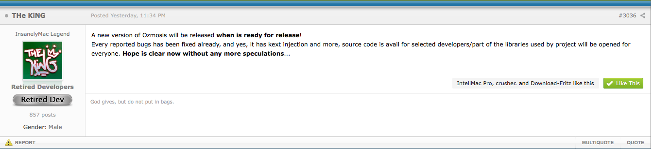 Ich habe weder gesagt, dass er nur Quark redet, noch dass es kein neues Ozmosis gibt. Ich hoffe selbst stark auf eine neue Ozmosis-Version, denn es ist eine schön einfache Möglichkeit OSX zum Laufen zu bringen ohne sich lange Gedanken über Kexte, Patches und Co machen zu müssen.