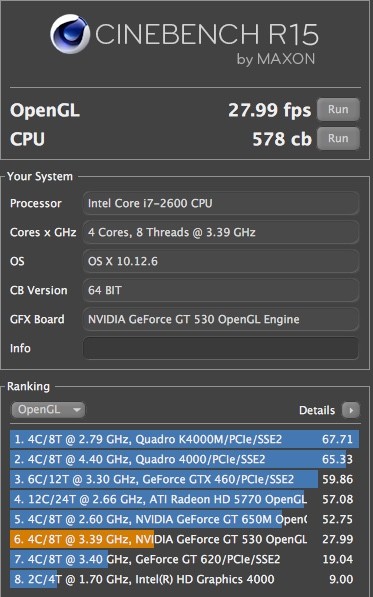 • Bei Cine OpenGL komme ich auf 135 fps, also ebenfalls ein höheres Ergebnis.