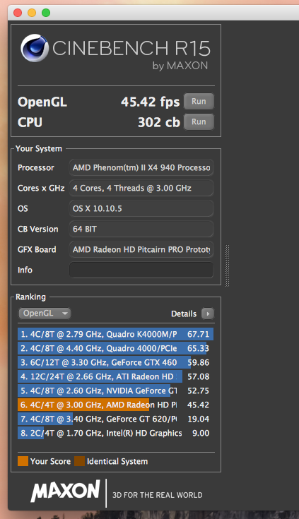 • Richtig was die OpenGL Performance angeht stecken die AMD Karten die NVIDIA Karten locker in die Tasche <img src="https://www.hackintosh-forum.de/wcf/images/smilies/biggrin.png" alt=":D" />