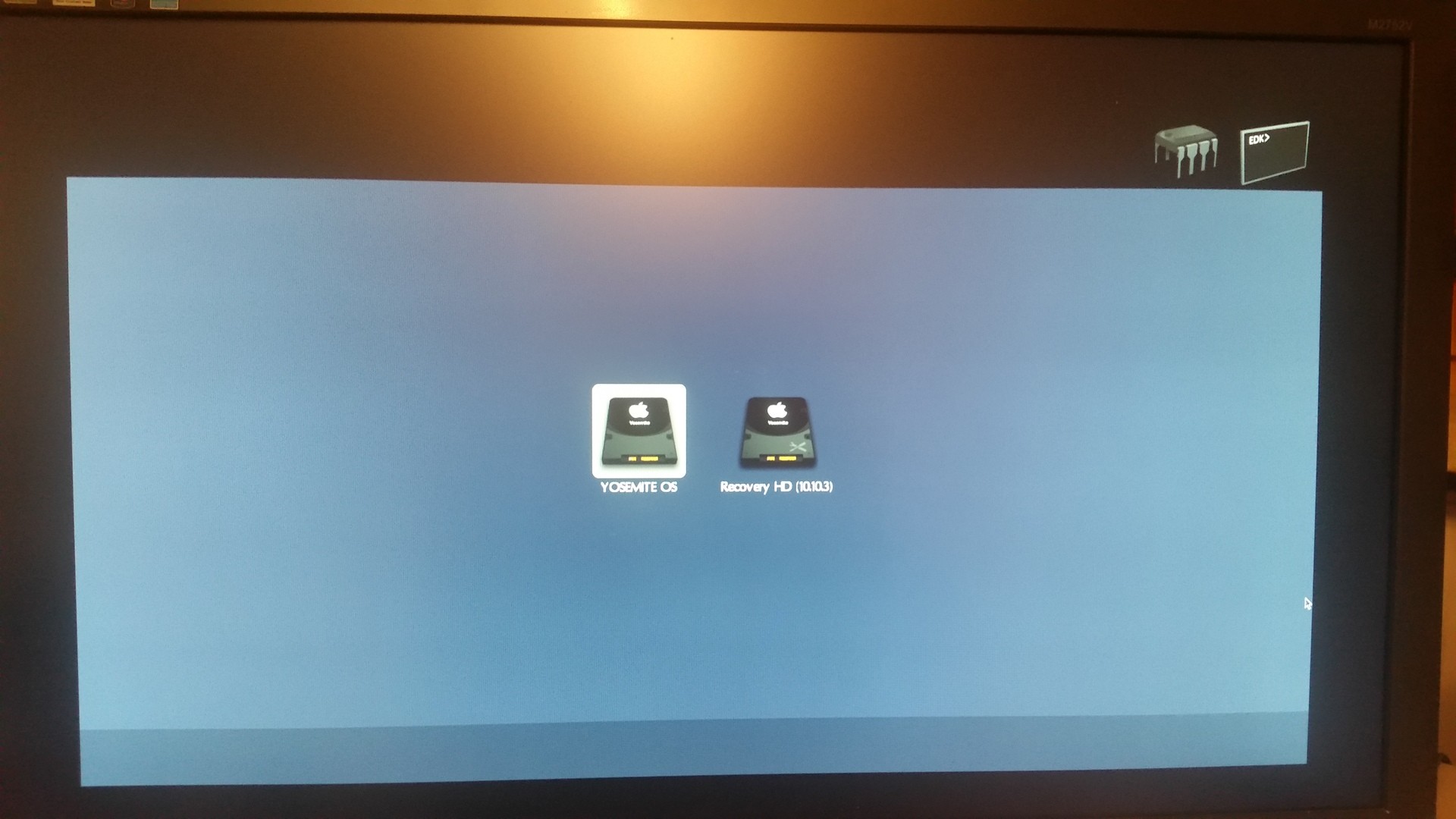 Wenn ich Pos1 drücke komme ich in diese gui wie auf dem Bild. Oben links auf den Baustein komme ich ins Bios und oben rechts das EDK funktioniert nicht. Lässt sich nicht anklicken.