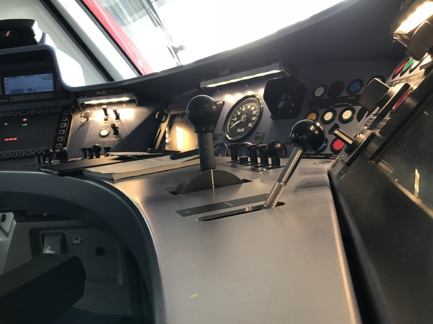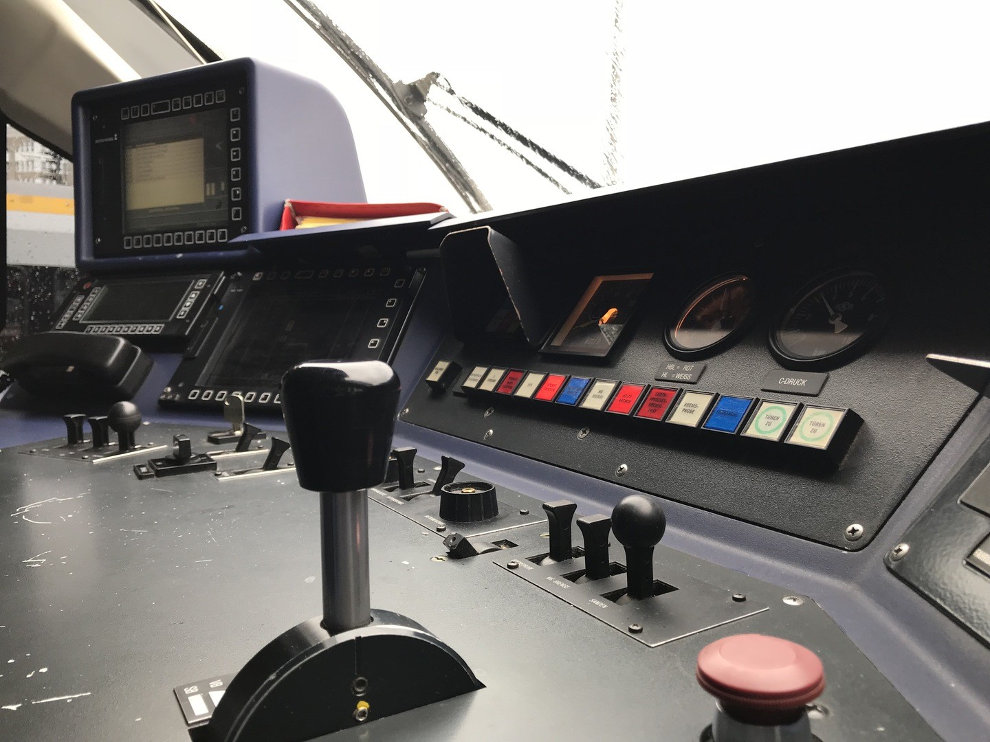 Hier ein Bild vom Führerstand der Baureihe 644, ebenfalls ein Dieseltriebfahrzeug, allerdings mit diesel-elektrischem Antrieb. Dieses Fahrzeug ist bei uns im Kölner Raum auf der Linie RB38 vom Köln nach Bedburg und zurück unterwegs.