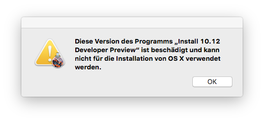 Der Installer muss mit createinstallmedia erstellt werden. Wenn der Stick oder die Partition USB heisst und die Install 10.12 Developer Preview.app im Programmordner liegt folgendes im Terminal eingeben:Oder man benutzt mein neues Tool.