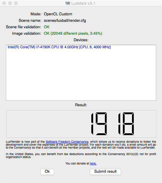 Jeder der LuxMark Tests dauert 2 Minuten. Wäre schön wenn ihr hier weitere Werte posten könntet, ich pflege sie dann in die Tabelle ein.