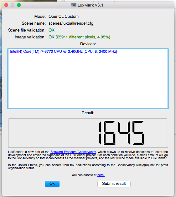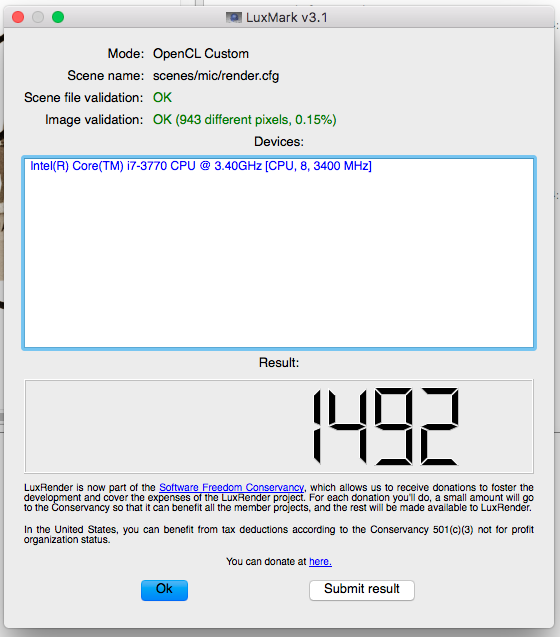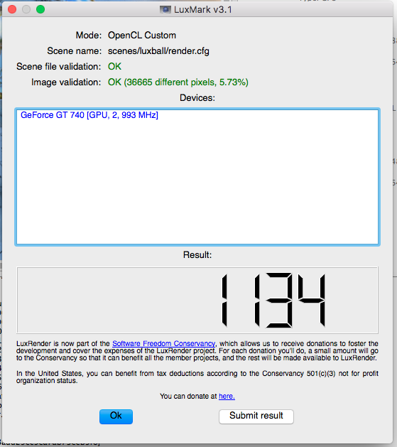 Was mich freut ist das ich unter Sierra die besten Werte erreiche. Aber nur mit dem Web Driver. Der Cuda Driver bring da gar nix bei diesem Test.Ansonsten sind die Ergebnisse bei allen drei System fast gleich.Weis einer warum unter OpenSuse und unter Windows 10 bei diesem Test der Prozessor als Auswahl fehlt? Denn gibts bei mir nur unter Sierra. Rechnet OpenGL denn mit beiden, GPU und GPU? Ansonsten bedeutet das Ergebnis ja auch das die Grafikkarte den Prozessor ausbremst.