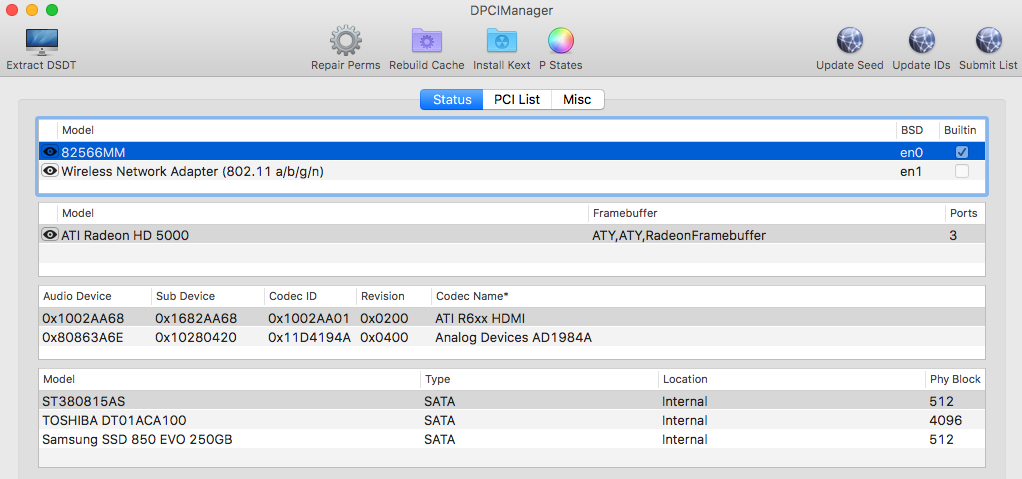 • Also bei Euch beiden scheitert es nur an der Grafik, der Dell Ansicht läuft ja. Ich bin ja nun auf insanely schon seit dem Yosemite-Thread dabei, es kamen immer mal wieder Leute, die mit der HD5450 Probleme hatten. Ich kann leider nicht sagen, ob neuere, spätere Karten irgendein anderes Bios drauf haben. Die Mehrzahl der HD5450-User kann mit diesem Vanilla-Patch auf 68E0 arbeiten. Warum es bei Euch nun nicht geht ist mir echt ein Rätsel, zumal die Karte das gleiche Device hat. Die letzte DSDT hat jedenfalls keinen Eintrag mehr für eine bestimmte Grafik. Vielleicht habt ihr ja noch die Möglichkeit eine andere Grafikkarte zu testen. Optimal wäre eine Karte, die OOB läuft oder nur mit einem Inject-Haken. GT610 läuft OOB, leider nur bis Capitan. Die GT710 soll auch mit Sierra laufen auf dem Optiplex, wie einige User berichtet haben.