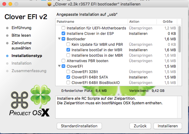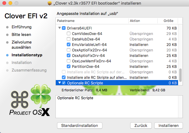 Clover wurde mit der Version 3577 installiert. Der Installationsstick mit Clover für den Legacy-Support wurde wie folgt installiert: