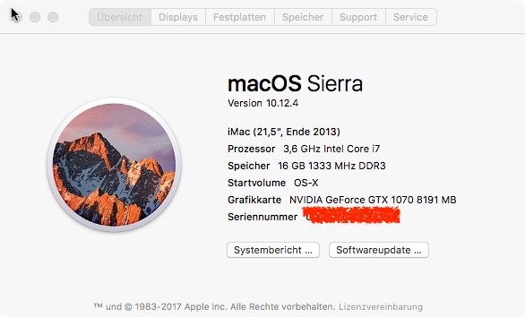 | Gigabyte | GTX1060 6GB | 2xDVI-D, HDMI, DisplayPort | 10.12.4 | 378.05.05.05f01 | DP wird genutzt (4K) keine Probleme |