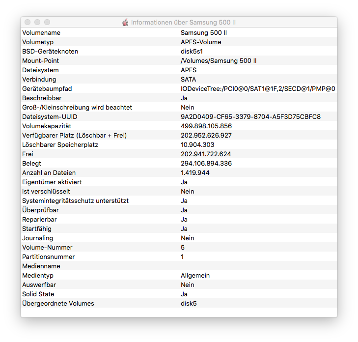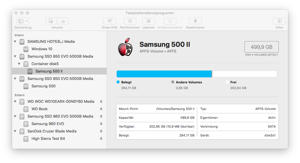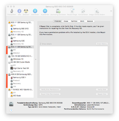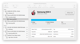 Leider braucht man ja das gute alte Yosemite-Festplattenprogramm, um die komplexe Struktur graphisch darzustellen, und wirklich überzeugend übersichtlich ist das auch nicht, da haben sich in der Darstellung schon wieder andere Platten zwischen die verschiedenen Container (rot markiert) dieser einzigen APFS-Platte geschummelt..