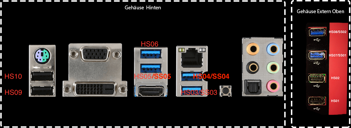 Das waren bei mir also HS13 und 14 (die einzigen USB2-Ports) und HS01 - HS06 die gleichzeitig auch SS01 - SS06 sind. Somit komme ich auch nicht über das 15-Port-Limit. -