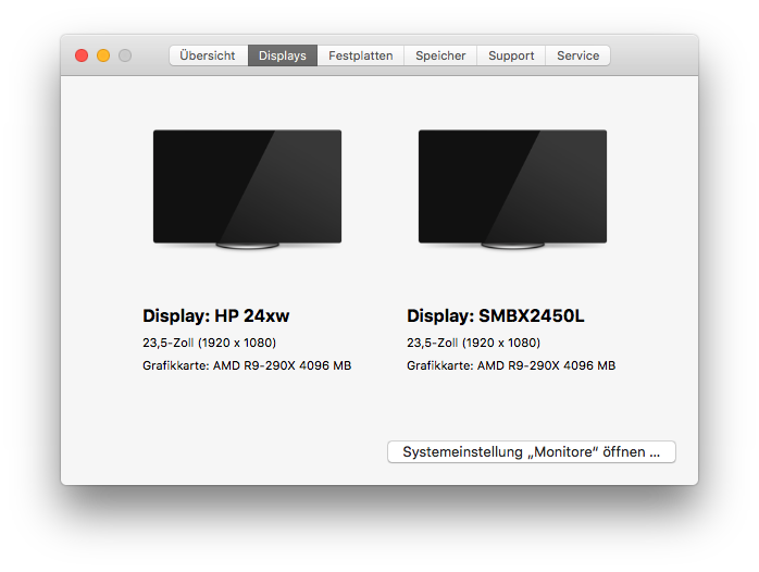 Für die R9-290X musste ich mit WEG auch die Connectors in der DSDT/SSD definieren da sonst auch hier nur der DP laufen wollte. Ohne WEG (ist im Grunde mit dem RadeonDeeinit in Clover nicht mehr nötig) bekomme ich die Karte mit folgenden Einstellungen in Clover zum laufen: