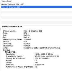 Ich würde nicht an der Intel GPU rum basteln, die soll ja nur ein Bild für die Installation liefern. Damit die GTX 1070 zusammen mit dem Web Treiber funktioniert, muss der Haken bei System Parameters --> NvidiaWeb gesetzt werden. Zusätzlich brauch man beim iMac18,x auch die NvidiaGraphicsFixup.kext + Lilu.kext. Und im Bios muss natürlich von der iGPU auf die PCIe Karte umgestellt werden.