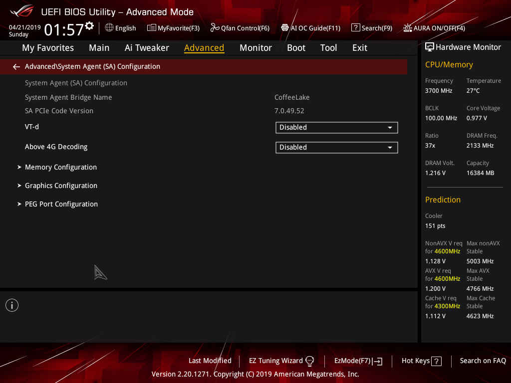 • Unter "Advanced\System Agent (SA) Configuration" kannst du den "VT-d" auf "Enabled" stellen... der wird seit einigen Versionen direkt im Clover Bootloader abgefangen und muss nicht mehr speziell deaktiviert werden.