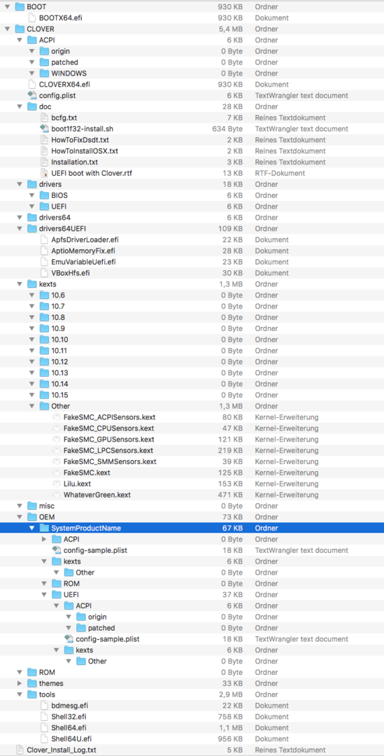 • Naja deinen gesamten EFI Ordner als .zip ohne die Ordner APPLE und themes wäre deutlich hilfreicher als nur ein Bild davon. Gängige Methode hier.