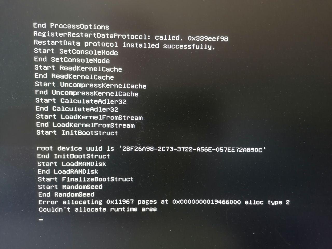 EDIT1: wäre zu schön gewesen. während der 2. Stufe der Installation (von SSD) ist der Prozess eingefroren. Jetzt nach nem Reset stehen zwar die anderen Bootoptionen (Recovery, Install auf SSD, etc) mit in der Liste, starten aber natürlich nicht vernünftig. auch das booten vom Stick scheitert wieder am fehlender allocate runtime area...