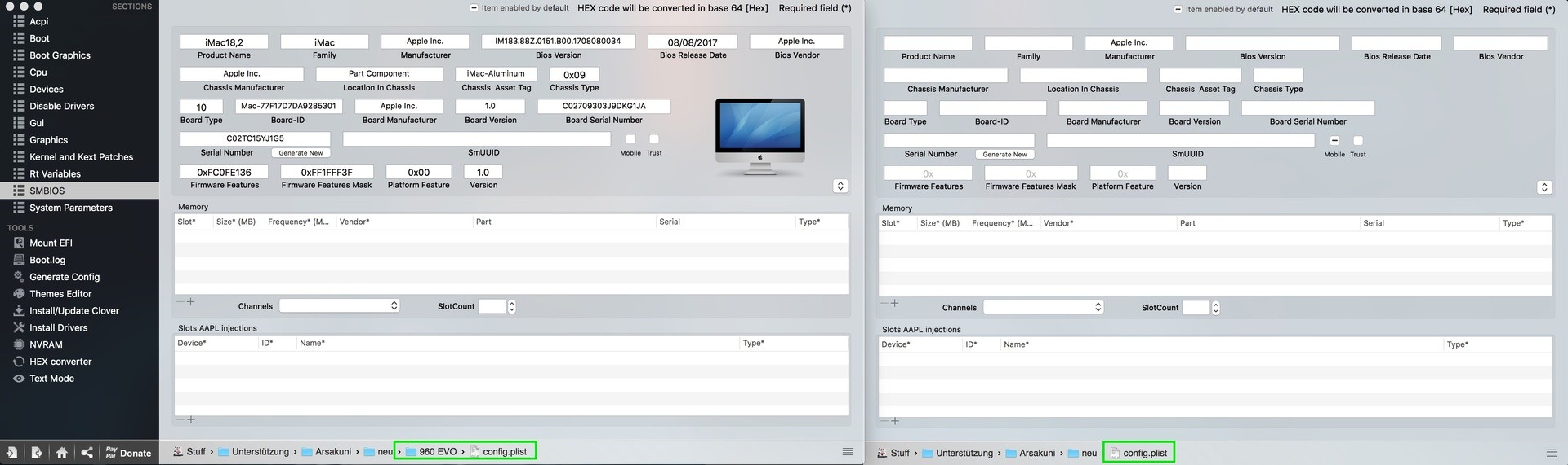 • Okay, ich probiere dann einfach eine SMBIOS aus. Aktuell habe ich den "iMac18,2". Du hast meine Frage zum Clover Bootloader glaube ich übersehen? Egal welchen von beiden ich nehme?