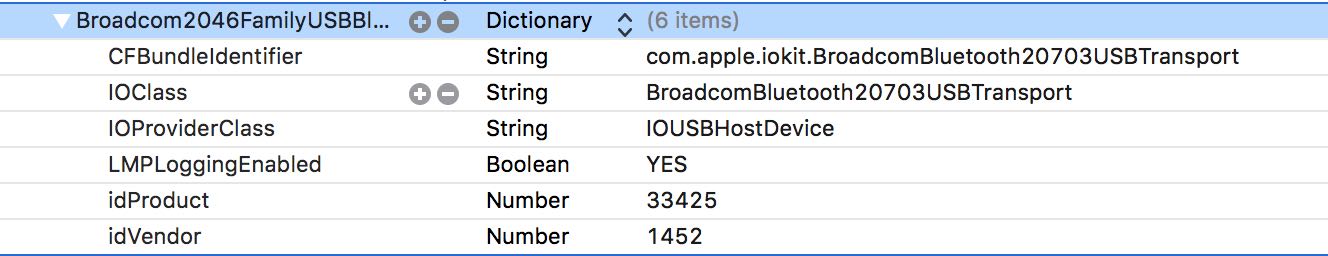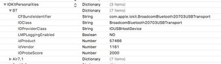 Fangen wir mit der Info.plist des BroadcomBluetoothHostControllerUSBTransport.kext an. Tausende Einträge, alle rufen dieselbe Klasse auf und unterscheiden sich durch idProduct und idVendor.