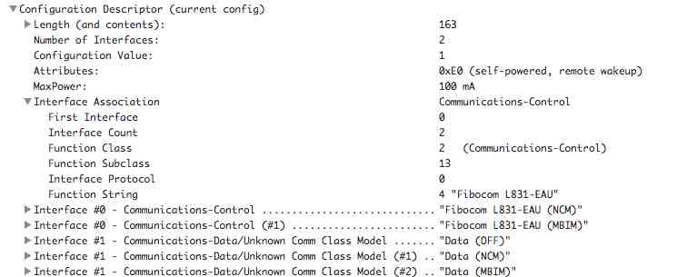Der L831-EAU hat laut USB Prober in der momentan ausgewählten Konfiguration 4 Endpoints inkl. des Endpoints 0. Der Endpoint wird vom Gerät zur Verfügung gestellt. Die anderen 3 Endpoints müssen von einem oder mehreren Interfaces zur Verfügung gestellt werden.
