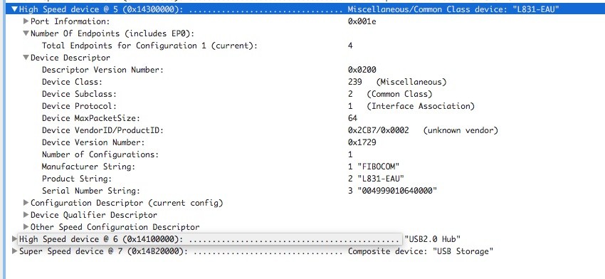 In der ersten Zeile erfahren wir, dass es sich um das fünfte USB Gerät handelt, über USB 2.0 (High Speed) kommuniziert und am Port 3 (die 3 in 0x14300000) hängt, der Klasse Verschiedenes angehört und das Gerät L831-EAU heißt.