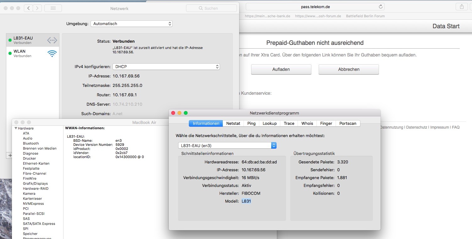 Zurück zu MacOS. Offensichtlich wird ein Ethernettreiber geladen, es kommen nur keine Daten, vermutlich besteht keine LTE-Verbindung.Mühsam