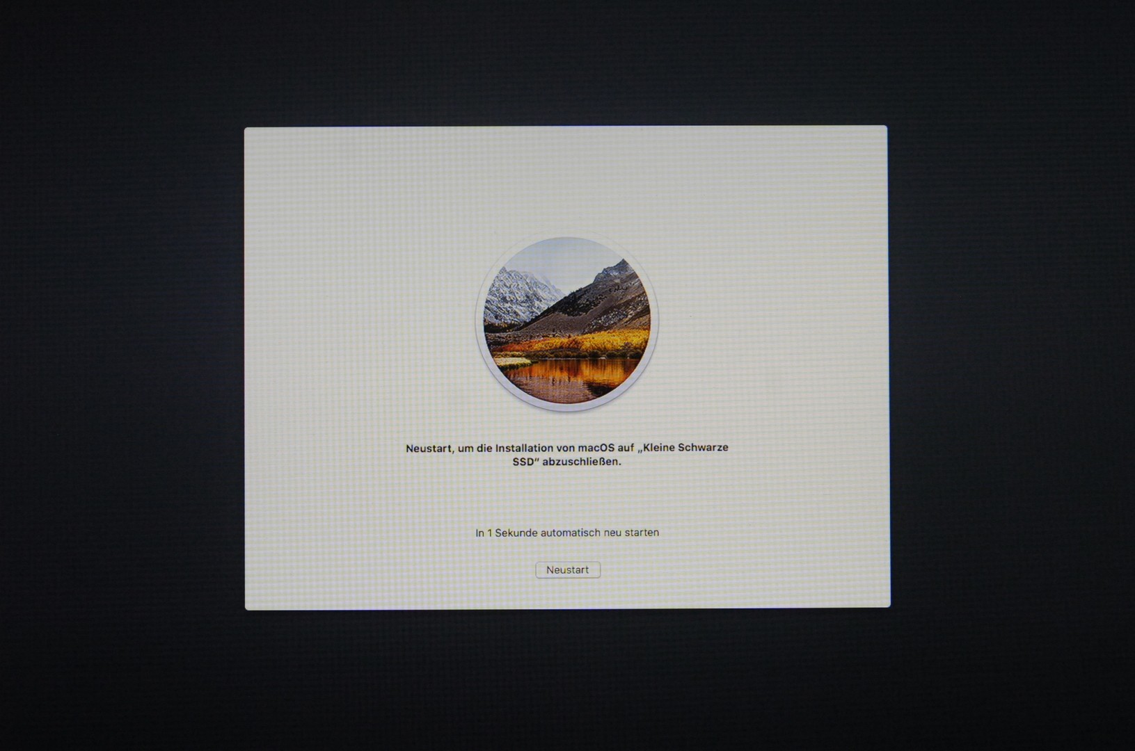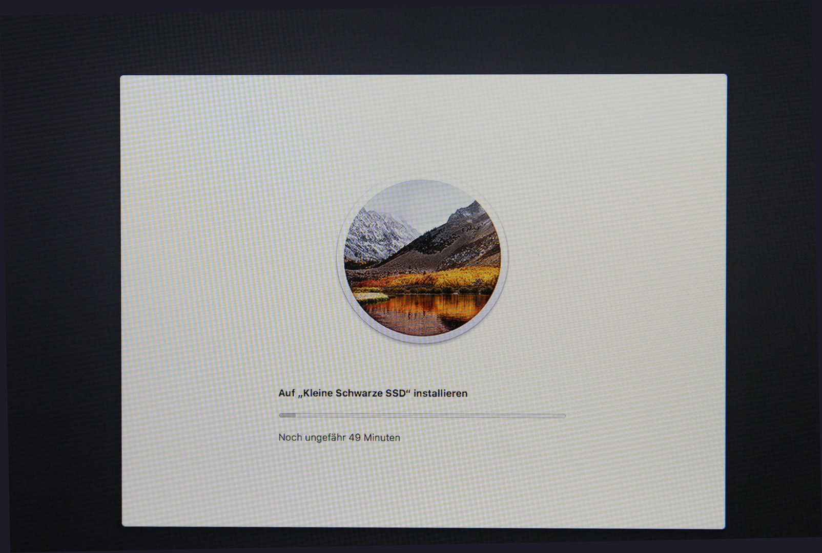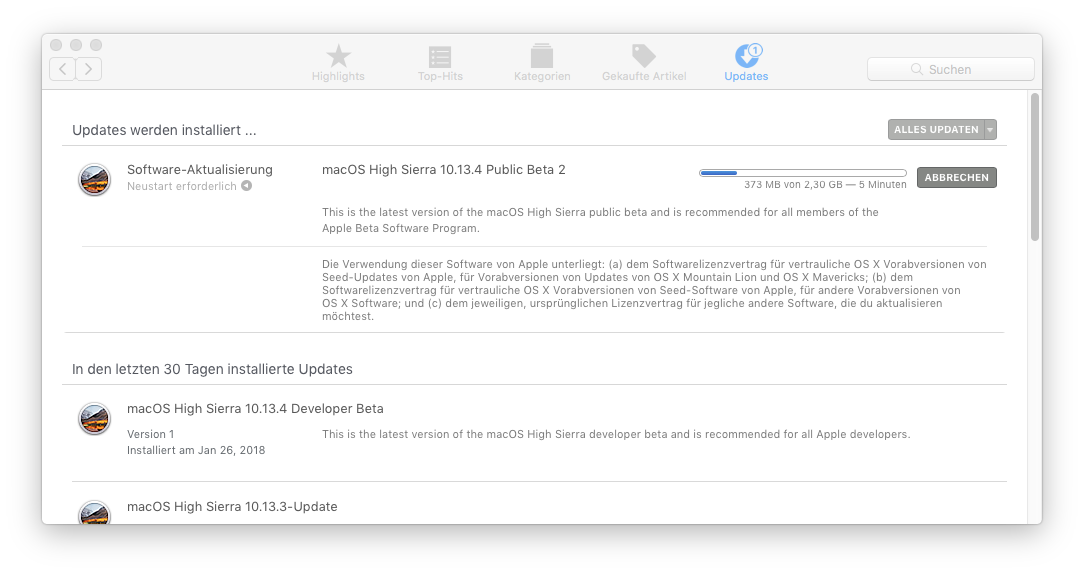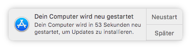 Je nach Update und verwendeter Festplatte ist die Angabe sehr unterschiedlich, Systeme mit rotierenden Platten und RAIDs zeigen hier deutlich längere Anfangszeiten als reine einzelne SSDs. Bei einigen Updates der Beta-Versionen von High Sierra wurde hier erstmal 23 Minuten angezeigt, aber nach kaum 30 Sekunden erfolgte schon ein weiterer Neustart.