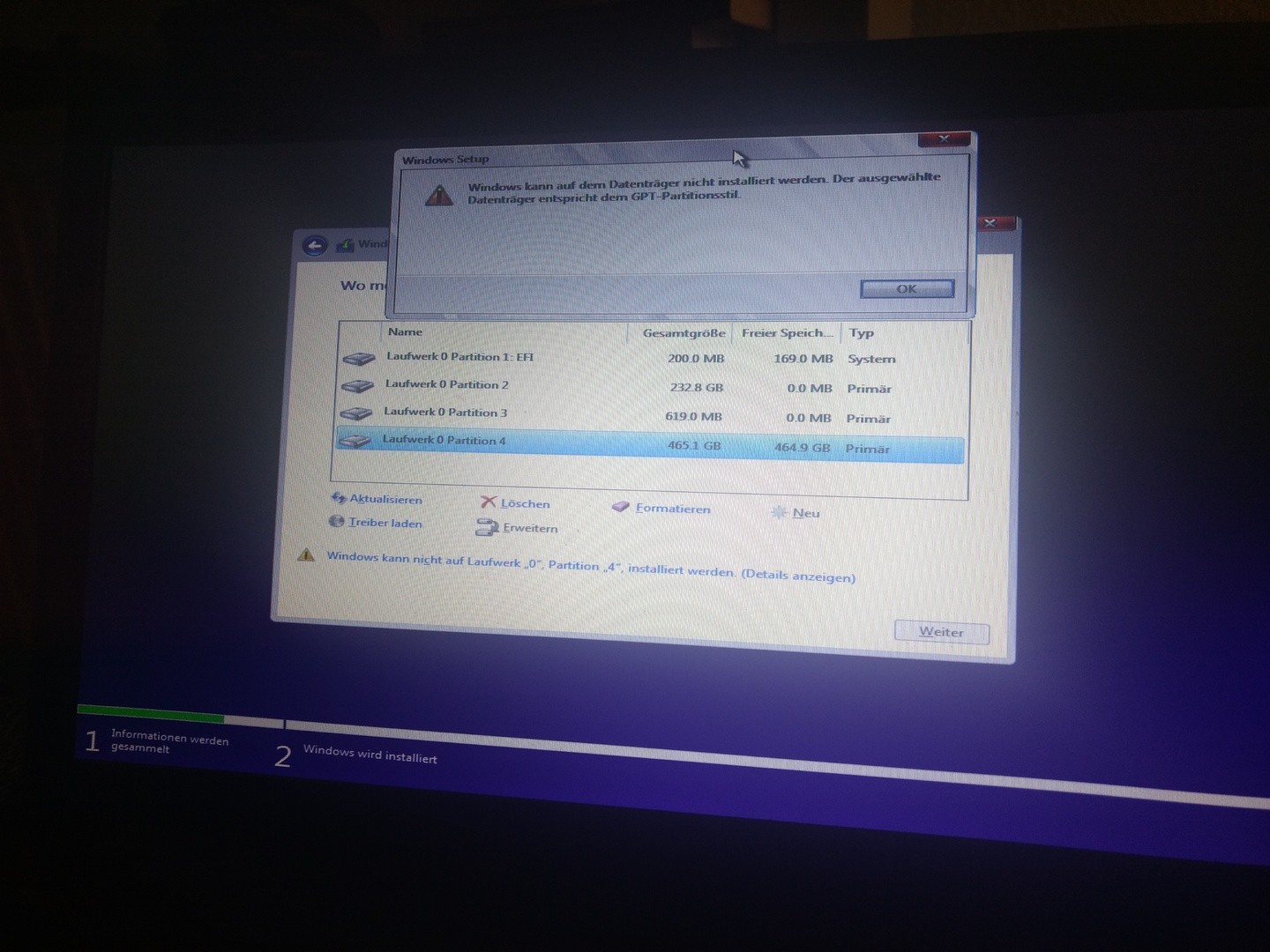 Bei der Installation von win 10 steht da Windows kann auf dem Datenträger nicht installiert werden. Der ausgewählte Datenträger enstpricht dem GPT-Partitionsstil