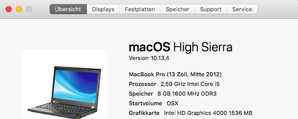 Konfiguration: X230, I5 3320 (2.6 GHz), Intel HD 4000, 8 GB Ram (DDR3-1600), Samsung EVO SSD (120GB), Audio ALC 269 (Angabe ohne Gewähr), OSX 10.13.3