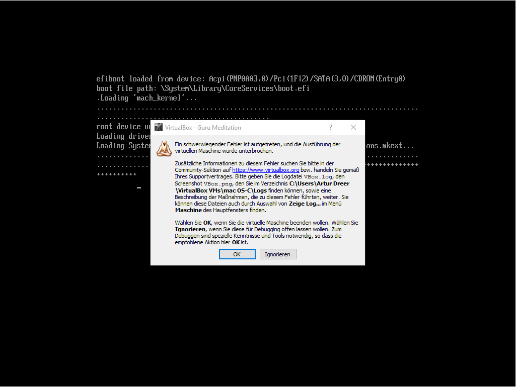Ich hab auch die andere Anleitung im selben Thread ausprobiert. Da hatte ich eine andere version von VirtualBox 5.2.2. Ich hab die Einstellungen übernommen und musste erstmal mit einem bootloader starten (nur Hack Boot funktionierte). Dann hab ich Snow Leopard installiert, aber dann konnte ich kein Update downloaden um El Capitan zu bekommen oder die VM fährt nicht mehr richtig hoch.