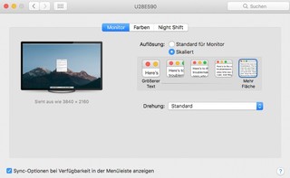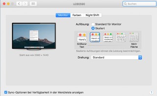 mal eine generelle Sache in Sachen OS X... mittlerweile wird die Auflösung unter OS X ja nur noch als entweder "Optimal für Monitor" angegeben oder halt skaliert, wenn man skaliert anwählt bekommt man mittlerweile jedoch auch keine Technische Angabe in Form von Bildpunkten mehr, sondern nur noch diverse Icons und einen Schieberegler der zwischen "größerer Schrift" und "Mehr Fläche" entscheiden lässt. Tatsächlich stellt man darüber jedoch die Auflösung ein.
