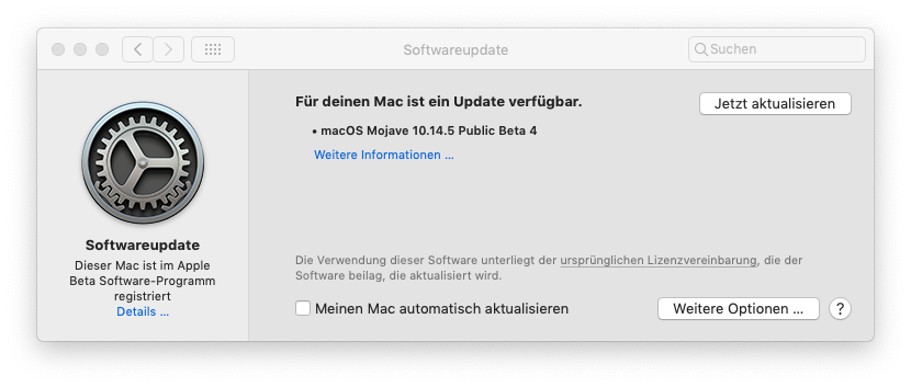 Update 10.14.5 Beta (18F127a) sauber und ruckzuck durchgelaufen
