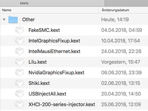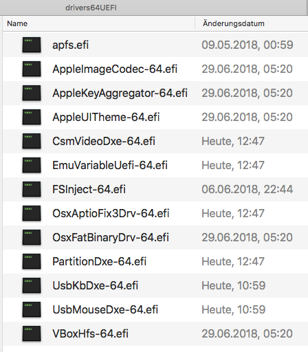 Die Ordner „drivers64UEFI“ & „kexts“ habe ich als Screenshot dem Beitrag angehängt. Ich habe jeweils die aktuellste Version der Kexte eingefügt.