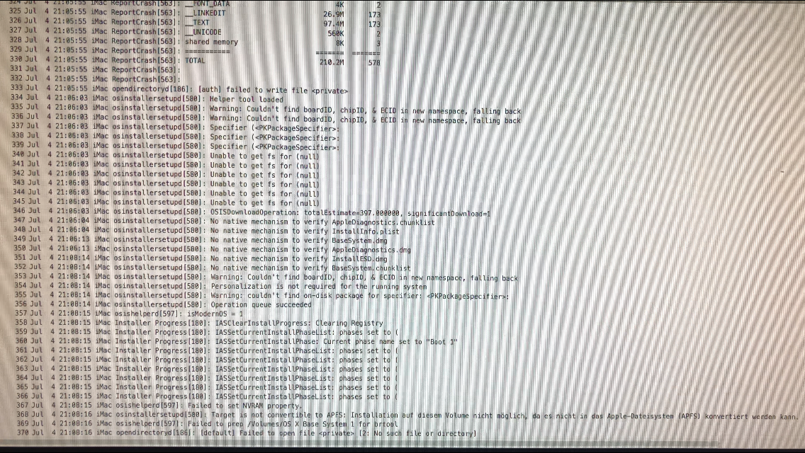 • Es crashen unterschiedliche Dinge: einmal ist es der LanguageChooser, dann die sandboxd, manchmal auch der ganze macOSInstaller