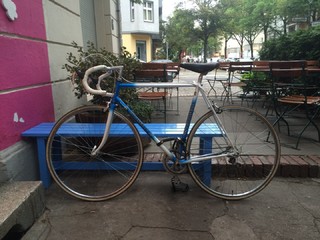 Das Schmuckstück (ca. 1985(?) mit 'ner Shimano 105-Gruppe) stand als Retro-Dekoration mit zwei platten Reifen im Schaufenster unserer Nachbarschaftsapotheke. Ich bin rein und hab die Chefin gefragt, was sie denn mit dem Teil macht, wenn sie die Schaufenster neu dekoriert. War aus ihrem Keller, seit Ewigkeiten (1985 (?)) nicht mehr benutzt. Ich habe es ihr für 125 € und die Zusage, es wieder gelegentlich ins Schaufenster stellen zu können, abgekauft.
