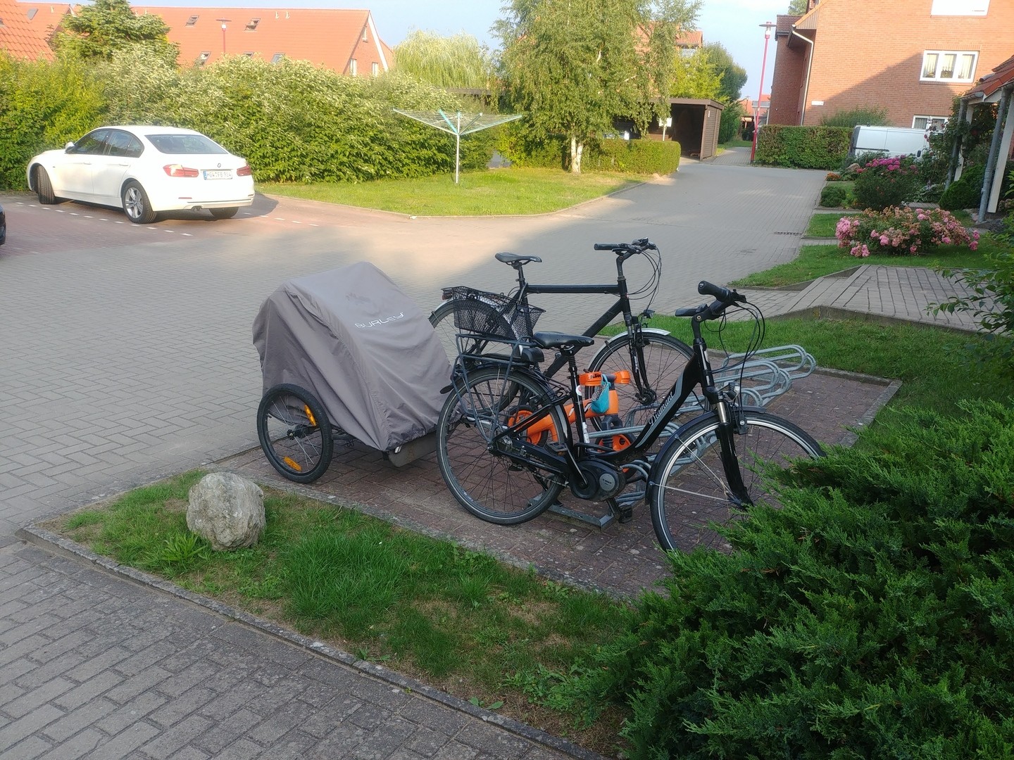 • Alle Räder der Familie auf einem Bild. Meine Frau fährt elektrifiziert, da sie meistens den Hänger mit dabei hat.