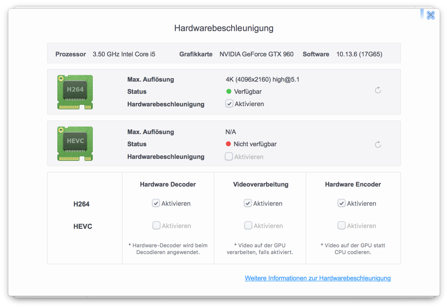 MacX macht bei mir h265 mit 70fps, h264 mit 200 und mit intel inject ohne id 450fps - für mich ist h265 also auch nicht so interessant