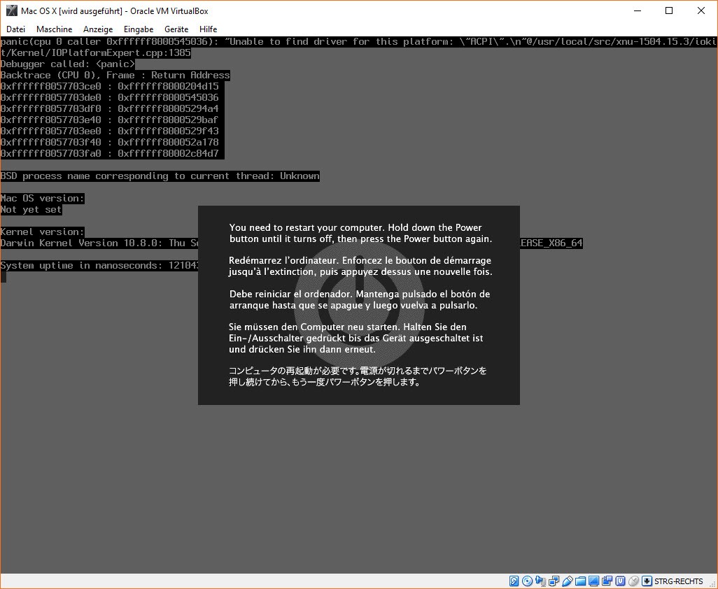 • wenn eine direkte installation mich mit so einer kernelpanik (no drivers .... acpi) angrinst, würde ich die nullcpupowermanagement.kext ins spiel bringen. @all würde sowas auch in einer VM gehen?