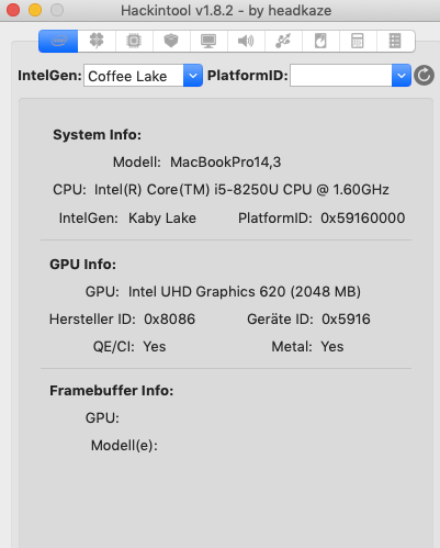 welche platform-id nutzt du für die IPGU und wie viele Framebuffer werden dir im IORegistryExplorer / IOJones angezeigt? Neben dem für das interene Display (AppleIntelFramebuffer@0) sollte da noch mindestens ein weiterer auftauchen. Den Kartenleser bekommt man meines Wissens nicht zum Laufen. Welche CPU ist verbaut?