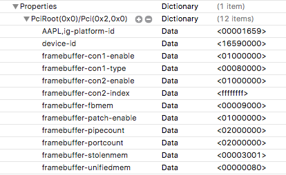 Unter Grafics habe ich zZt: inject Intel und die igplatform-id 0x59160000 eingetragen.