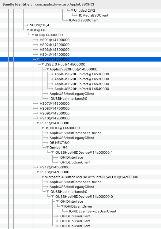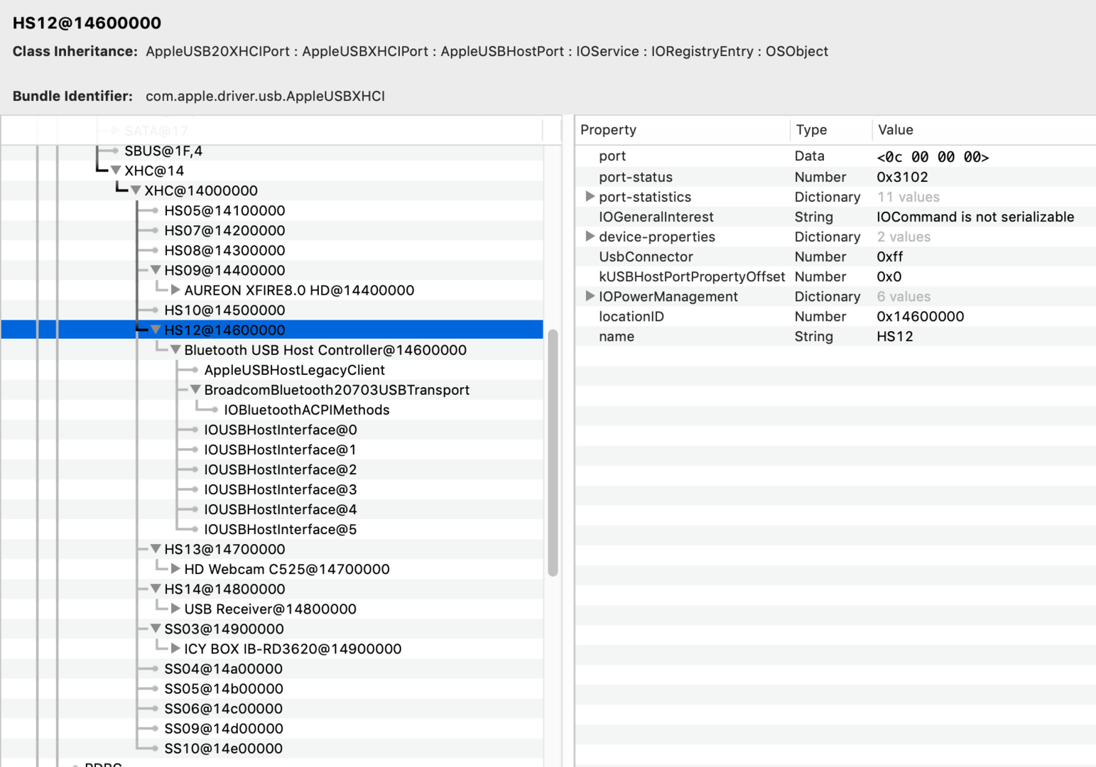 Das Herausfinden der Ports über den IORegistryExplorer gibt bei mir leider ziemlich seltsame Resultate aus (die sich zum Beispiel auch nicht mit dem FB-Patcher decken).Da ich meine Wakü USB-Hardware (das aquacomputer USB HUB mit angehängtem aquaero und aquastream) unter macOS nicht ansprechen muss, hätte ich eigentlich kein Problem damit den Port einfach zu deaktivieren (was mit der mit dem FB-Patcher erstellt KEXT auch funktioniert hat) aber das Verhalten im IORegistryExplorer gibt mir eher das Gefühl, dass da generell noch ziemlich viel im Argen ist