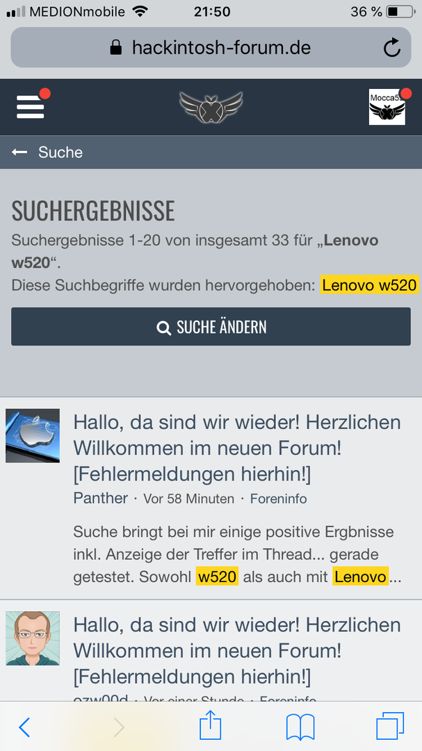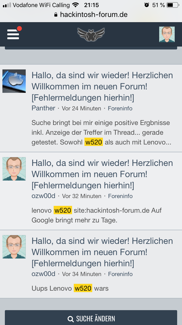 Eben getestet im alten und neuem Forum. Beide Suchen bringen mir die selben Ergebnisse. Wähle mal beim Suchen die Alles und Suche "Lenovo w540" dann kommt eine Vorauswahl und dann diese wählen. Da kommen bei mir 8 Beiträge.