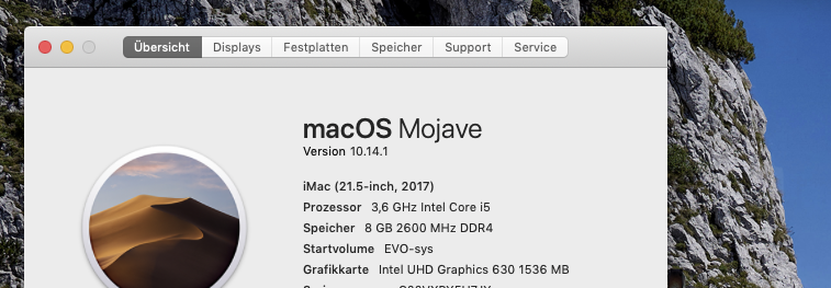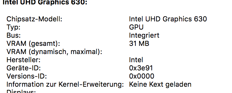 hab mit deiner EFI noch mal gebootet, stimmt, SMBIOS ist auf iMac18,1. Allerdings läuft die Grafik immer noch mit 31MB...