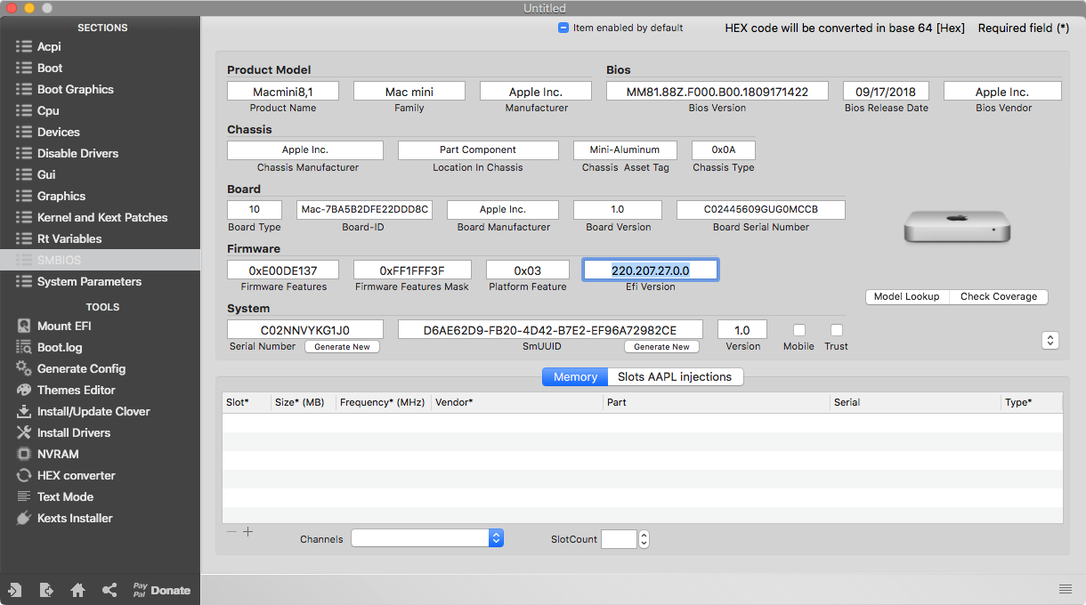 Das SMBIOS für den MacMini8,1 ist bereits seit r4746 in Clover enthalten, siehe hier. Im Clover Configurator noch nicht, könnte aber so aussehen: