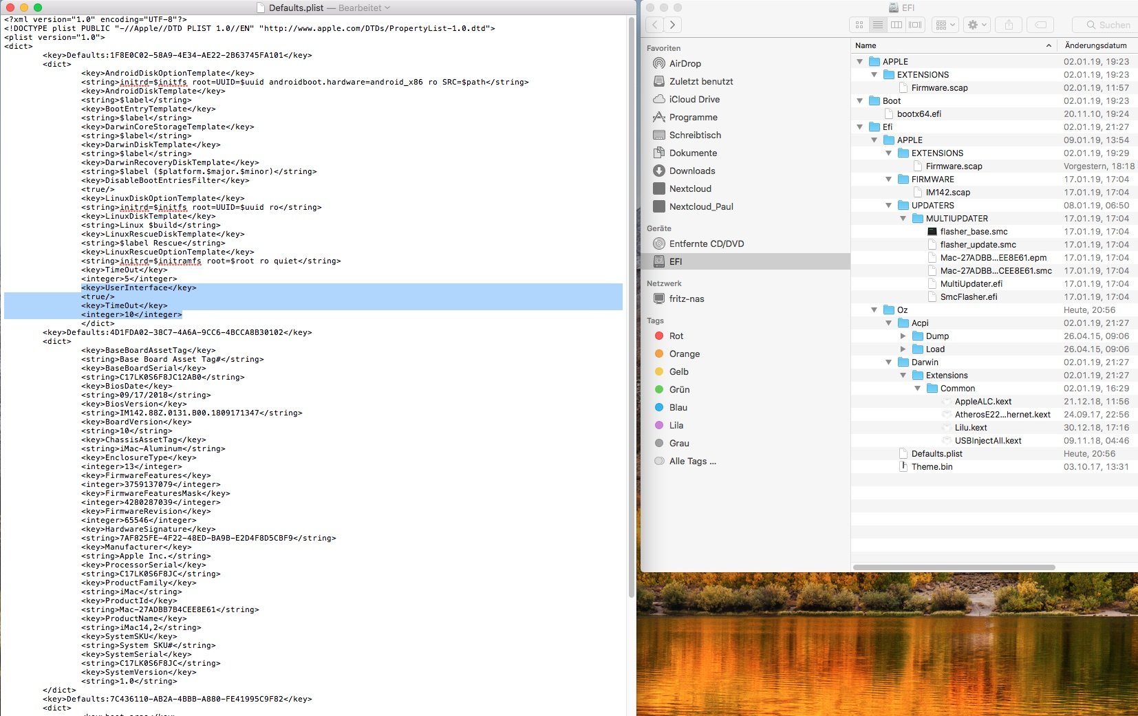 Hallo, die Theme.bin befindet sich in der Ebene /EFI/Efi/Oz, wie ich schon in #124 schrieb. Den entsprechenden Eintrag (UserInterface), um diese anzuzeigen habe ich gemäß Kuckkucks Anleitung in der Defaults.plist hinterlegt (siehe Screenshot dazu). Auch habe ich ohne Erfolg versucht das Menü mittels des Terminal Befehls