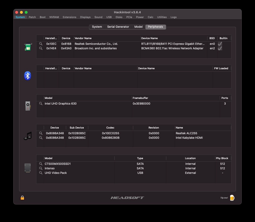 Bluetooth kexte sind keine vorhaben. und unter Hackintool taucht die Karte nur als Wifi auf.